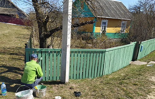 На фота: работнікі ААТ «Слонімскі кардонна-папяровы завод Альберцін" ажыццяўляюць рамонт і афарбоўку агародж былым работнікам прадпрыемства ўдзельнікам Вялікай Айчыннай вайны Блізнюку Аляксандру Яфімавічу і Агрымавіч Ніне Міхайлаўне.
